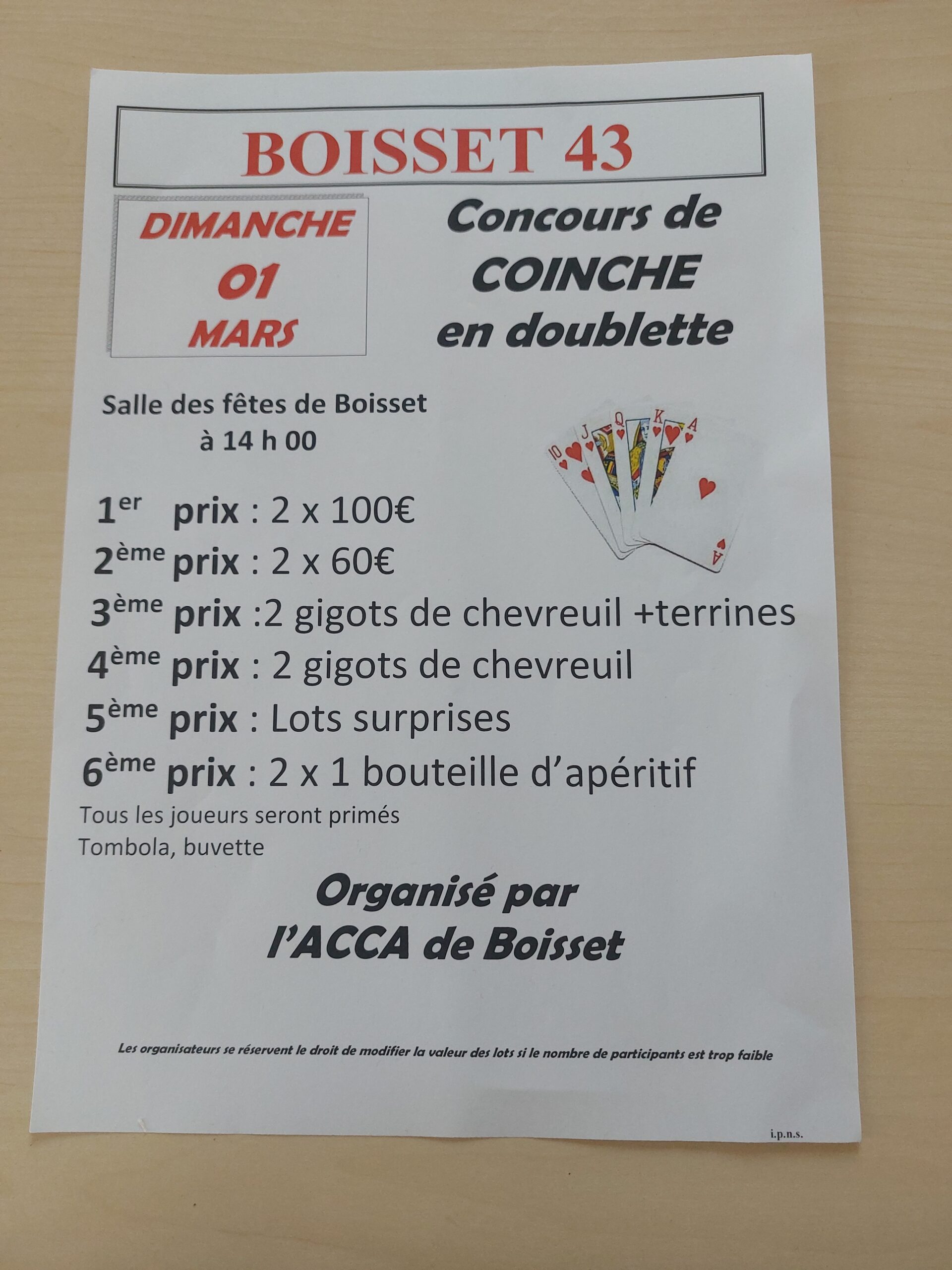 Concours de coinche en doublette, organisé par l’ACCA à la salle communale de Boisset.