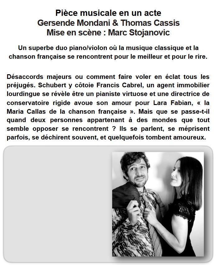Un superbe duo piano/violon où la musique classique et la chanson française se rencontrent pour le meilleur et pour le rire.