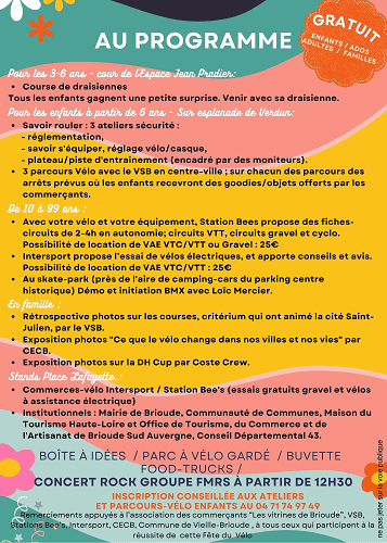 En départ libre : • chasse au trésor, circuit de 7 Km accessible à tous • Rando vélo : 4 parcours vélo route (de 20 à 50 Km) ; 2 parcours VTT/Gravel de 10 et 20 Km • A 10h et 17h : atelier de réparation vélo • A 11h et 14h : animation de wheeling. • A 11h et 14h30 : démo de VTT Trial • A partir de 14h : circuits pédagogiques, véloporteur (démo et balade) • A 15h30 : course de draisienne. Accès libre et gratuit.
