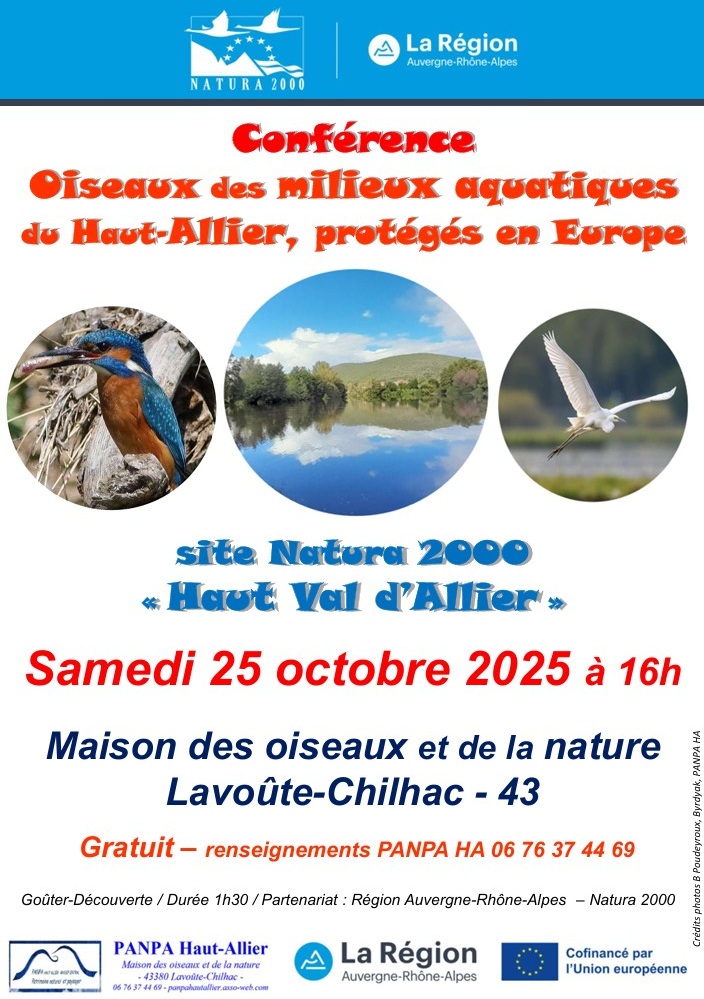 L’association PANPA Haut-Allier propose une conférence qui présentera les oiseaux des milieux aquatiques du Haut-Allier, et notamment une quinzaine d’entre eux, protégés en Europe.