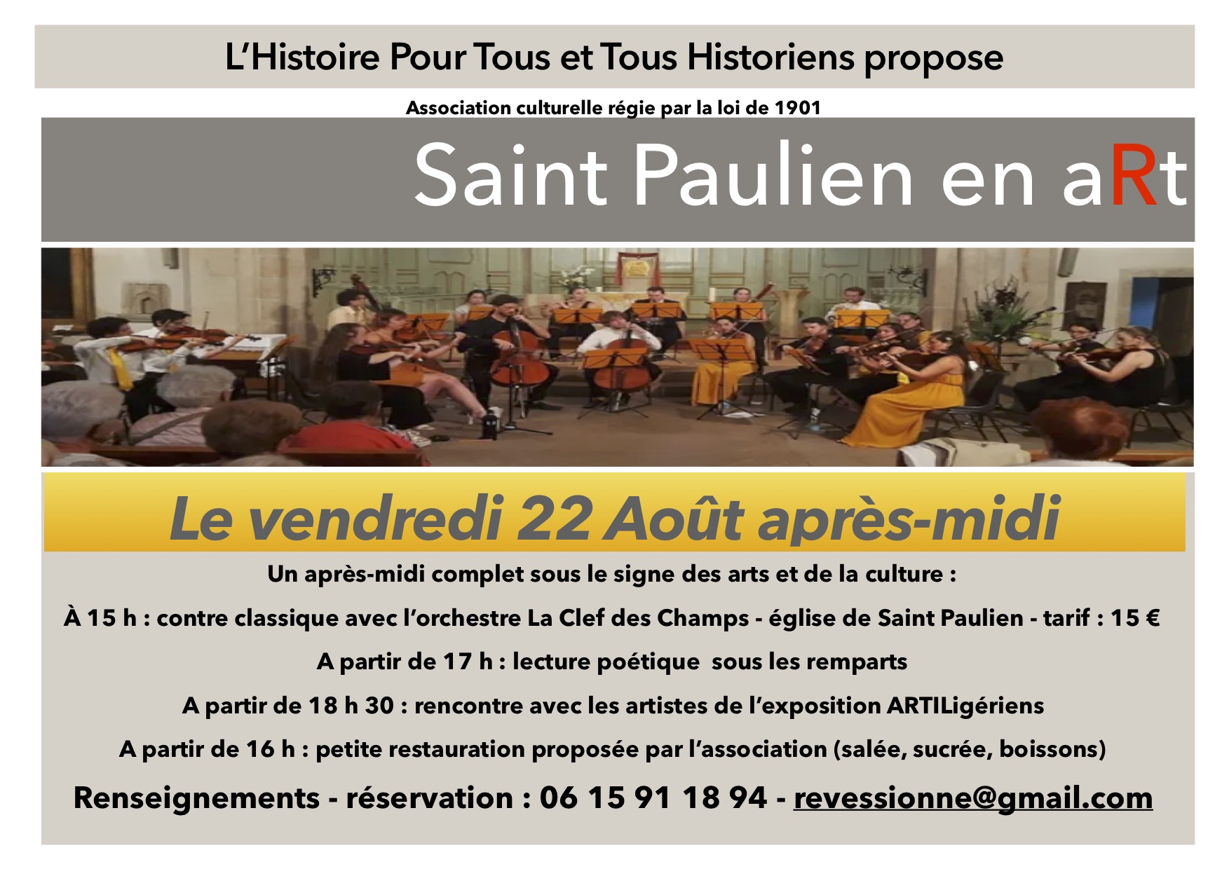 • À 15h : concert classique avec l’orchestre La Clef des Champs – église de Saint Paulien – tarif : 15 €