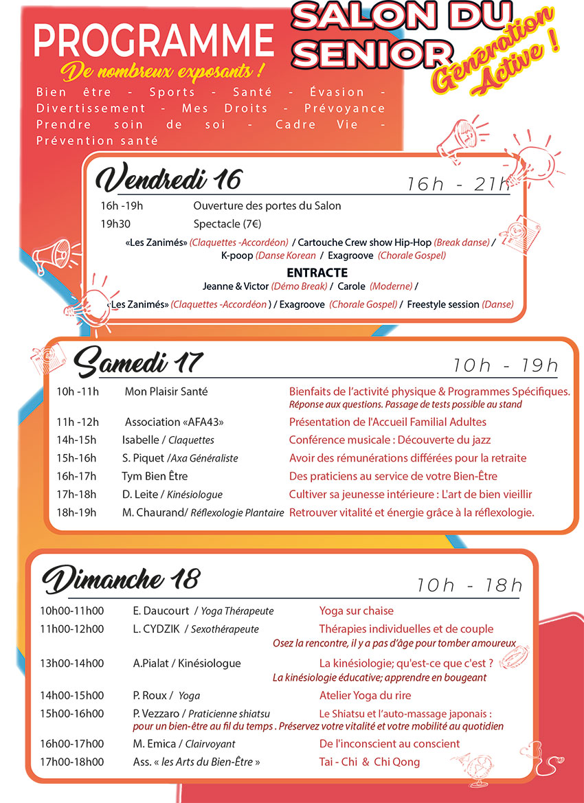 Avec des professionnels loisirs, santé, patrimoine, audition, voyage, activités physiques, logement, bien-être, résidence, hospitalier, paramédical. Entrée libre.