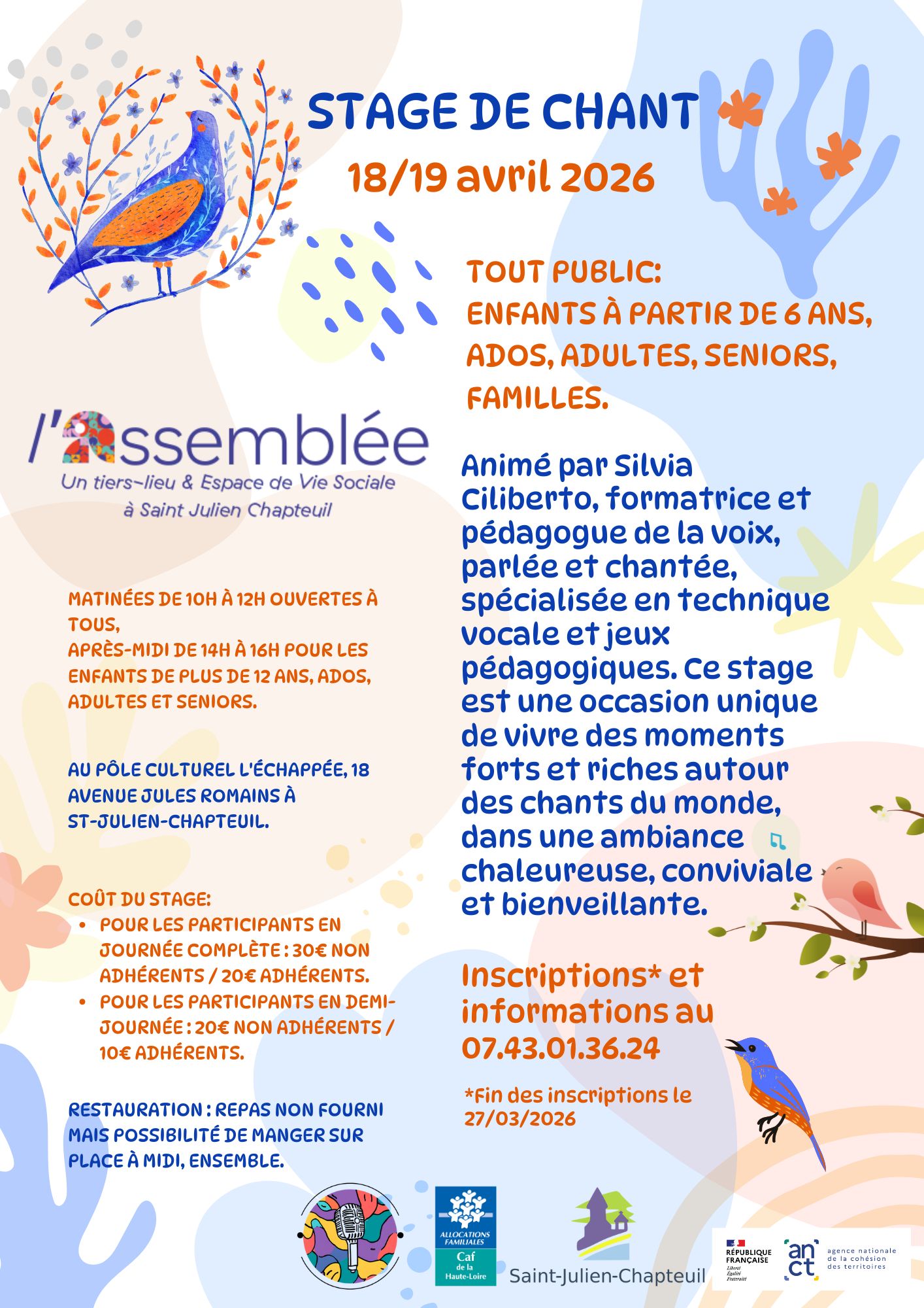 Animé par Silvia Ciliberto, formatrice et pédagogue de la voix, parlée et chantée, spécialisée en technique vocale et jeux pédagogiques. Ce stage est une occasion unique de vivre des moments forts et riches autour des chants du monde, dans une ambiance chaleureuse, conviviale et bienveillante.