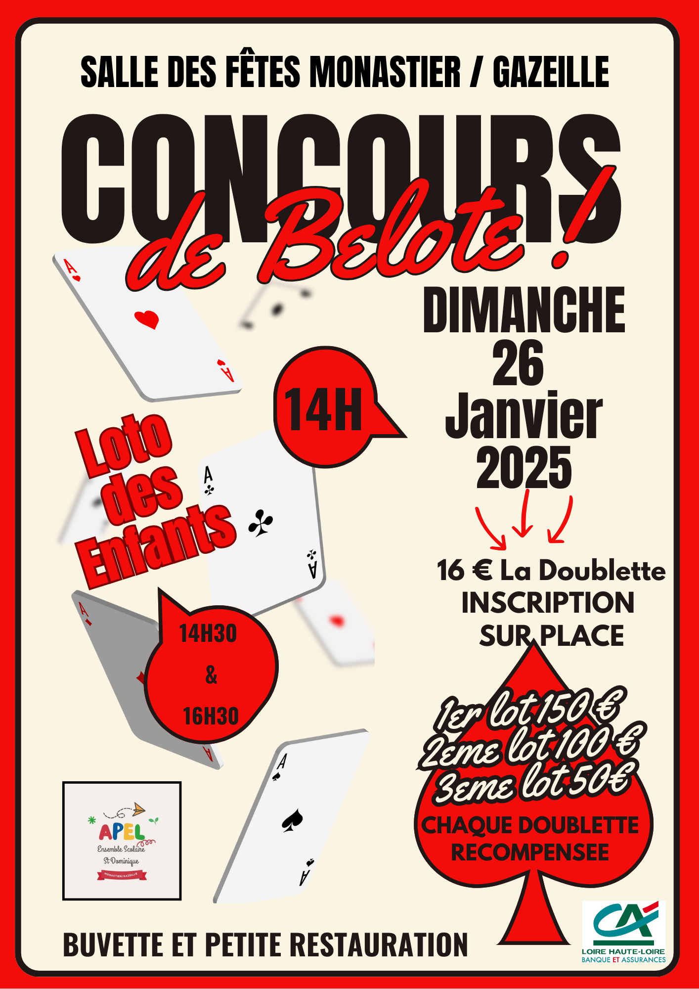 Comme tous les ans, les parents de l'APE vous proposent le traditionnel concours de belote. De nombreux lots à gagner et tous les participants seront primés ! Tarif : 15 € la doublette. Renseignements auprès de la présidente de l'APE : 06 11 15 20 43 (Cécilia Vigouroux).