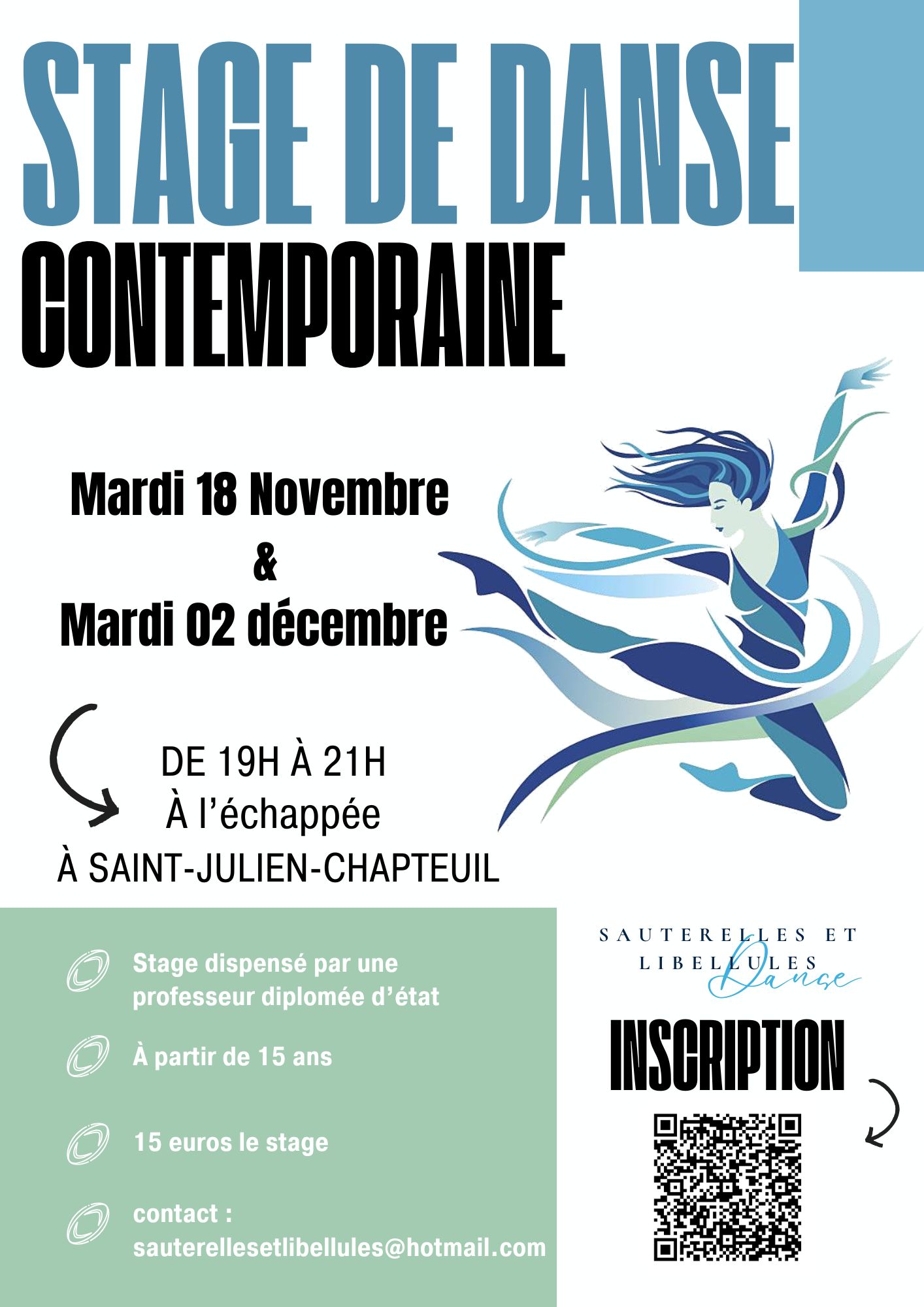 Sports-Loisirs | Saint-Julien-ChapteuilL’association « sauterelles et libellules » propose deux nouvelles dates pour découvrir ou redécouvrir la danse contemporaine. Ces stages, dispensés par une professeur diplômée d’état, sont ouverts dès 15 ans. Places limitées et réservables via helloasso. Tarif : 15 €