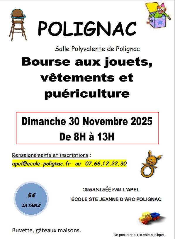 Sports-Loisirs | Le Puy-en-VelayBourse aux jouets, vêtements et puériculture Buvette sur place 5€ la table Réservation : 07.66.12.22.30 ou apel@ecole-polignac.fr